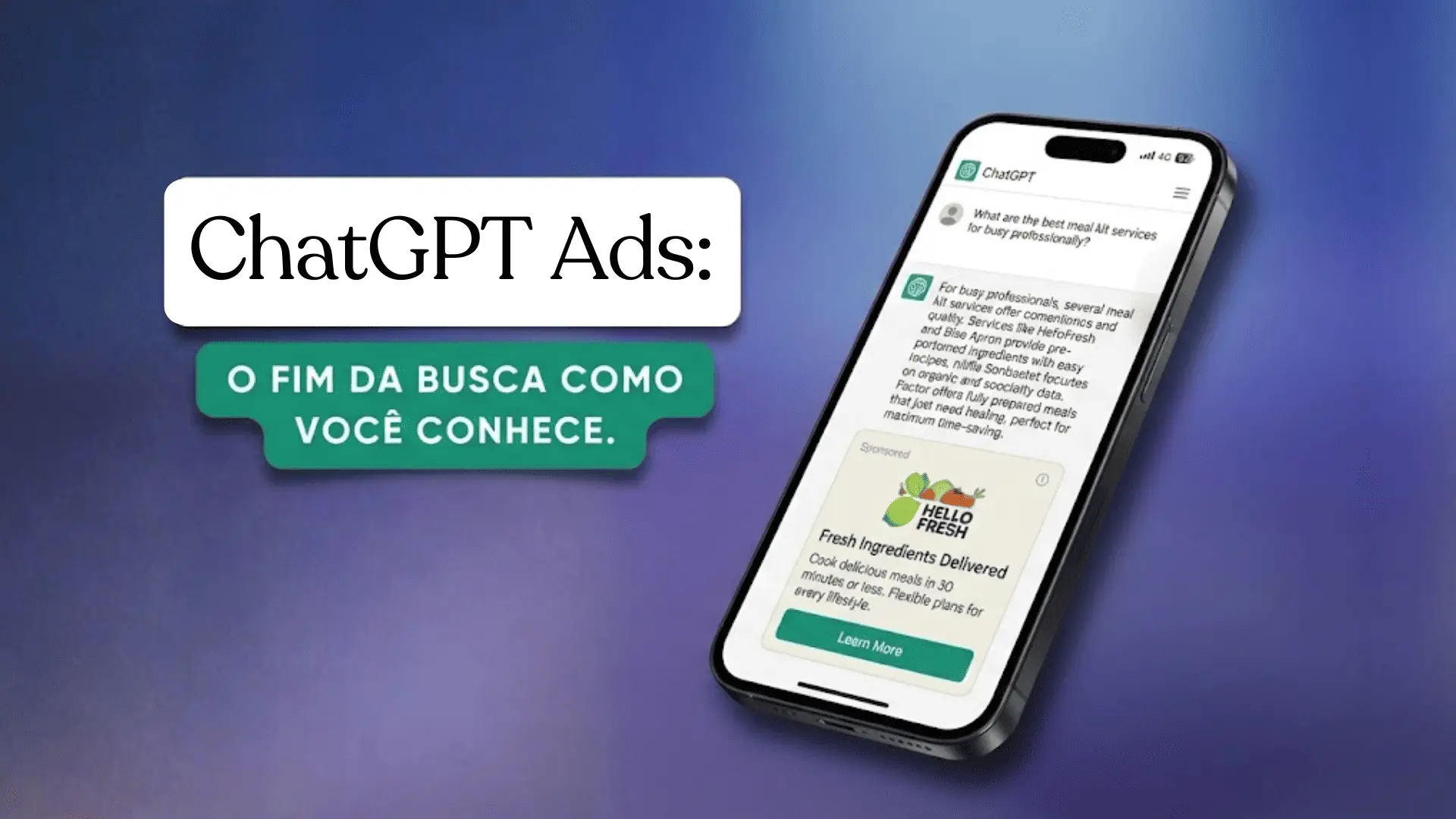 Pense assim: você faz uma pergunta sobre receitas vegetarianas, o ChatGPT responde com suas sugestões habituais, e logo abaixo aparece um bloco separado com um anúncio de um serviço de meal kit vegetariano. A resposta que você recebeu foi 100% orgânica, gerada pela IA sem interferência do anunciante.